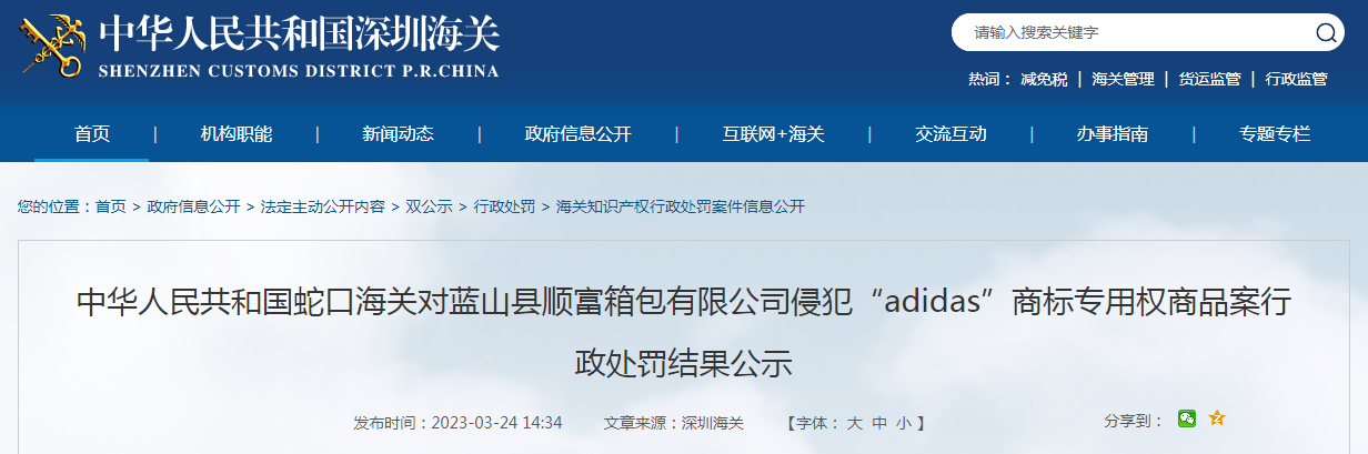 中国质量新闻网讯 近日,蛇口海关发布对蓝山县顺富箱包有限公司侵犯“adidas”商标专用权商品案行政处罚结果公示。