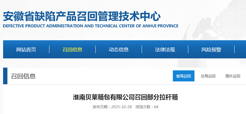 中国质量新闻网讯 据安徽省缺陷产品召回管理技术中心网站消息,近日,淮南贝莱箱包有限公司按照《消费品召回管理暂行规定》的要求,向安徽省市场监督管理局、淮南市市场监督管理局备案了召回计划,将自即日起,召回2025年3月制造的20英寸拉杆箱,涉及数量为100只。