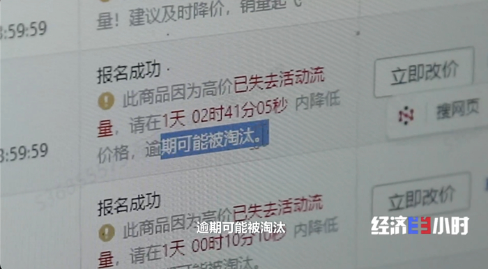 让当地企业更为愤慨的是,部分电商平台会用流量裹挟商户大打价格战,不降价就没有流量扶持。记者在调查中看到,一家箱包公司的产品被某电商平台认为是“高价”受到了警告:“此商品因为高价已失去活动流量,请在1天02时41分05秒内降低价格,逾期可能被淘汰”。
